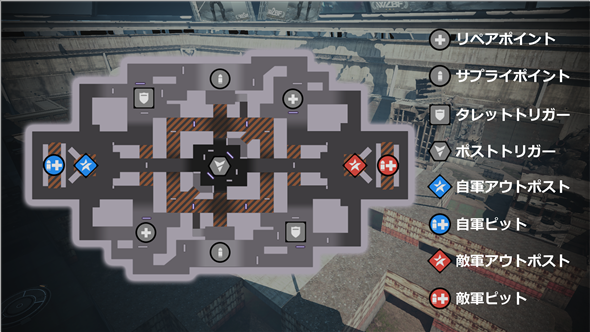 PTを囲むような通路が特徴のマップ。 基本形状は単騎戦?Map.Aとよく似ている。 PT制圧に向かうと上方から攻撃を受けやすく、注意が必要。 また、十字路が多く、通過時は側面からの攻撃にも気を付けたい。