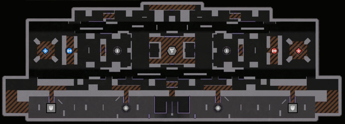 北側に3本のプラットフォームと2本の線路が走るエリア、南側に壁が乱立した中央以外が平坦なエリアを有し、それらを天井の低い通路で結ぶ横長のマップ。 パッと見は見通しがいいようにも思えるが、放棄された列車や、壁が至る所に置かれており、射線を塞ぎやすいマップとなっている。 ポストトリガーは4つのスロープを有する中央の高台に位置しており、見下ろす形となる分だけ守りやすく、攻めづらい。 高台の北側と南側に窓のような形で穴が開いているため、そこにグレネードを投げ込んだり、連携、裏取りによる多方向からの攻めなどが有効であろう。 リペア及びタレットトリガーは南側のエリアに存在しており、こちらは屋根はないが前述した通り、遮蔽物が乱立している。 これらを利用して進軍、防衛を行っていくのが主となるが、突発的な近距離での遭遇もあり得るため、常に注意しておくことを勧める。 さて、このマップにおいて曲者なのはポストトリガーが丸々天井に覆われてしまっているということ。 砲撃で防衛を手薄にしたり、牽制するというような手段はほとんど使えないため、他のマップのようにST機体で敵陣にダメージを与えるというようなことは期待できない。 また、遮蔽物が豊富なことや、天井が低いということもあり、ホーミングミサイルも扱いが難しいところ。 以上のように扱いにくい武器が出てきやすいマップなので、武装の構成について一考しておくといいだろう。