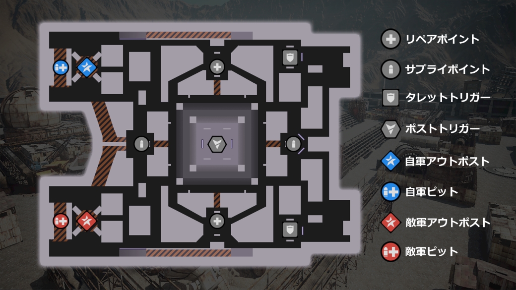 自軍アウトポスト.png敵軍アウトポスト.pngアウトポストチーム本拠点。中央にあるコアを直接攻撃することで